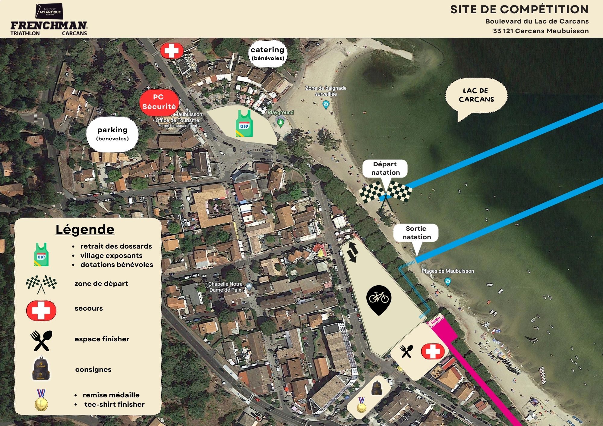 Vous trouverez dans le site internet et dans le guide du triathlète toutes les réponses à vos questions concernant notre manifestation. Gardez en mémoire que les règles édictées pour cette épreuve sont là pour vous aider et nous aider à organiser une course inoubliable. Durant cet événement, famille, enfants, amis, spectateurs pourront vibrer et vous encourager tout au long de la journée. Des activités situées autour du site de compétition permettront à chacun de passer des moments exceptionnels et ainsi de s’occuper durant toutes ces heures de triple effort.